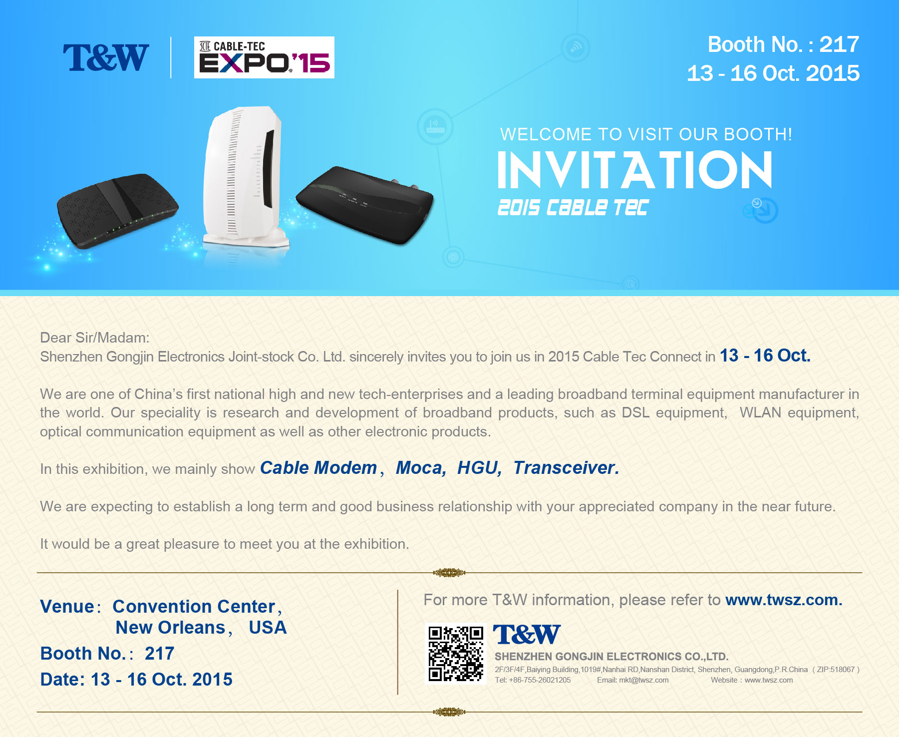 1. Exhibition Information: Name:2015 Cable Tec Date:13th-16th Oct. 2015 Country: New Orleans, USA Venue: Convention Center Booth No.:217 2. Invitation Letter 3. Floor Plan: