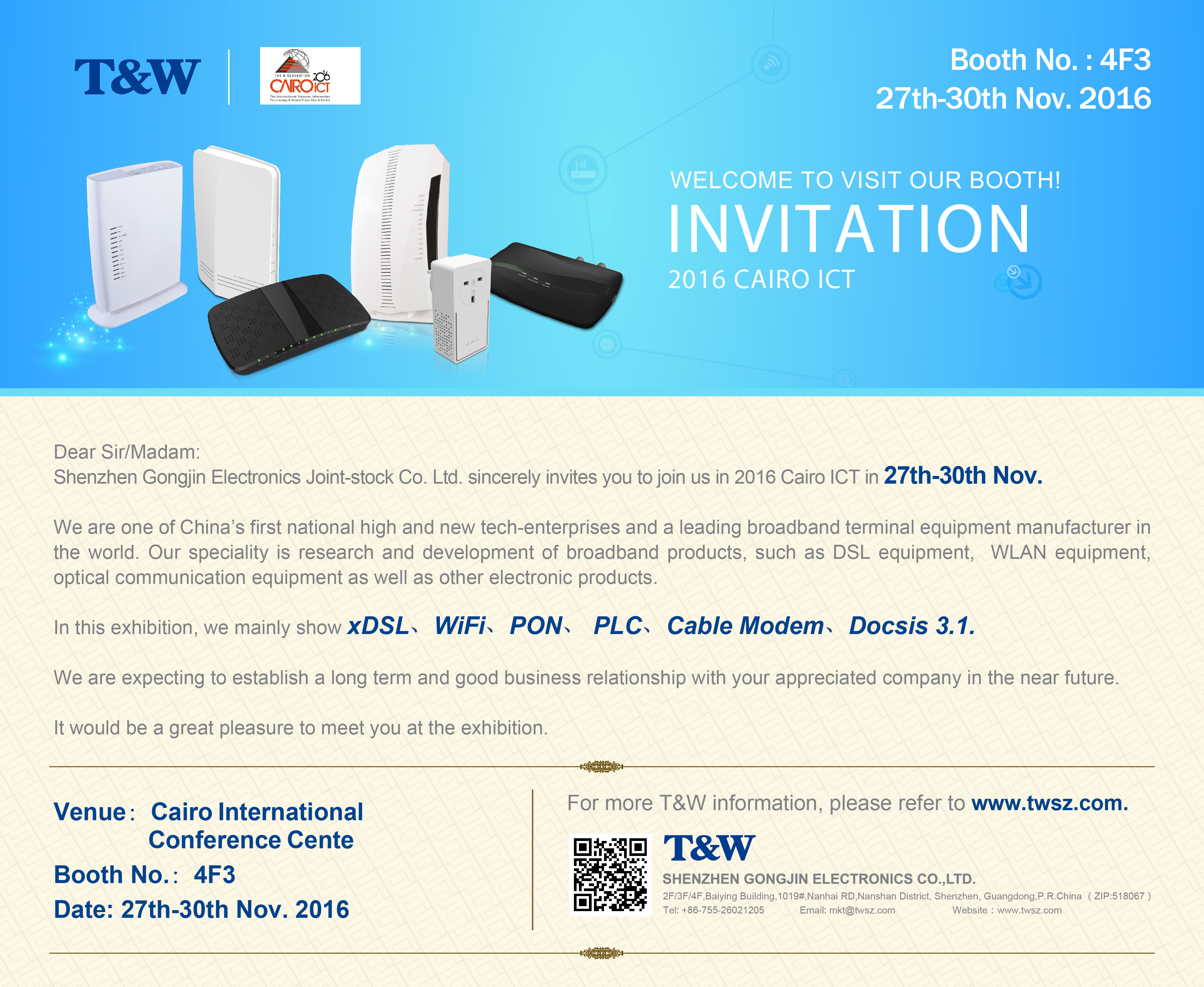 1.Exhibition Information: Name:Cairo ICT 2016 Date:27th-30th Nov. 2016 Country:Cairo,Egypt Venue:Cairo International Conference Center BoothNo.:4F3 2. Invitation Letter 3. Floor Plan: