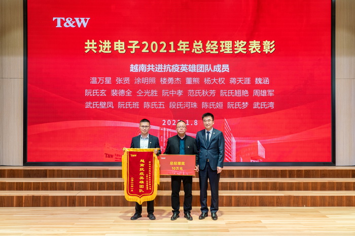 The conference continued in the afternoon. The company solemnly commended 30 outstanding innovation projects. Company General Manager Hu Zumin, Deputy General Manager Wang Lan, Deputy General Manager Gong Pusheng, and Executive Vice President Wei Honghai of Business Division of Netcom made a brief report about the company’s key innovation projects respectively. At the same time, General Manager Hu presented General Manager Award to the team of anti-epidemic heroes of Vietnam Gongjin. The bonus was 100,000 yuan. During the period of massive outbreak of COVID-19 in Vietnam in 2021, all employees of Vietnam Gongjin fulfilled their duties, conquered all obstacles, worked against the clock, rushed to realize the targeted capacity, and made every effort to organize production and guarantee deliveries. In order to praise advanced members and carry forward the combatant spirit, General Manager approved the presentation of this special general manager award.