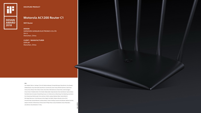Motorola Router C1 is self-owned brand product which is jointly researched and developed by Industrial Design Department, Wireless Application Product Line and Soplar Science and Technology. The entire project is brave in exploring in terms of market analysis, product orientation, industrial design, interactive design, structural design, hardware design, antenna design and user experience, breaks inherent mode of the company and takes the initiative in innovation, and Motorola Router C1 finally won favor of iF design award judge by its ultrathin appearance, innovative structure, novel antenna, excellent performance and friendly users experience. Motorola Router C1 will be collected into Germany iF Museum, and will be exhibited on global design exhibitions, will compete with Apple, Huawei, MI and other famous brands on the same stage, which can greatly promote global popularity and industrial influence of our company.