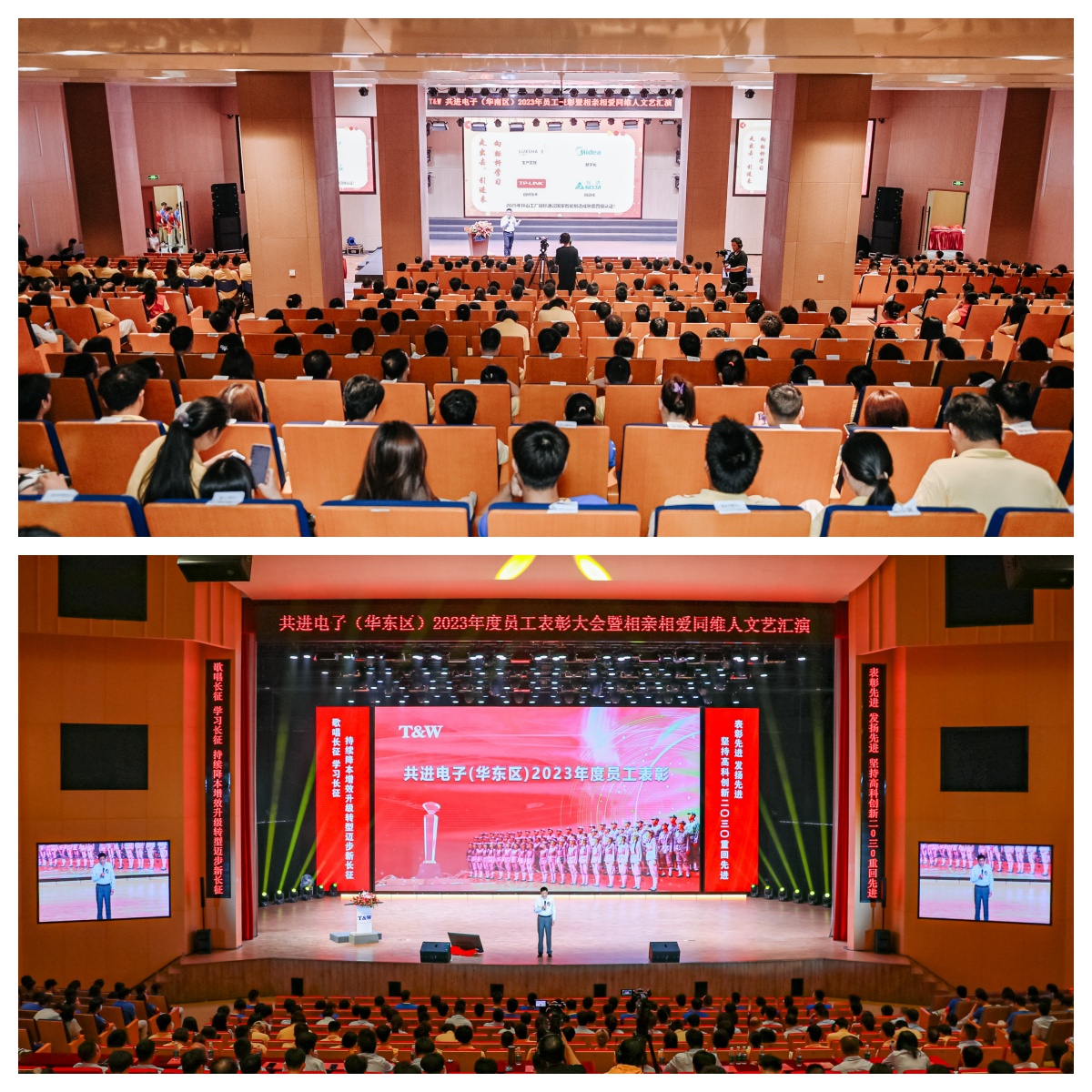On May 25th and 28th, Gongjin Electronics South China and East China held the 2023 Employee Commendation and Mutual Love Tongwei Cultural and Artistic Performance in Pingshan and Taicang Industrial Parks. Cadres and employee representatives from all over the country gathered together to participate in the grand event. The conference recognizes outstanding individuals and teams for the year 2023, and outstanding employees contribute the program "Long March Songs", singing about the Long March, learning from the Long March, and taking steps towards a new Long March. Employees from Nanshan and Haining attended online.