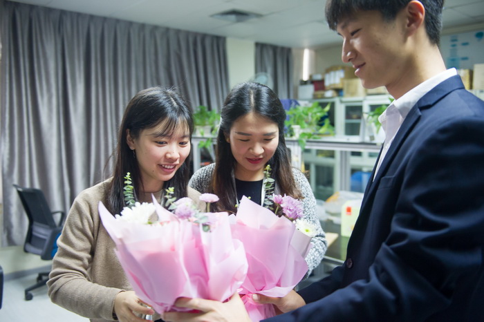 深圳蛇口——蛇口总部行政部今年特意找到两位又高又帅的“小鲜肉”,走到办公位上,为所有女神送上节日礼物:鲜花1束及护手霜1支。