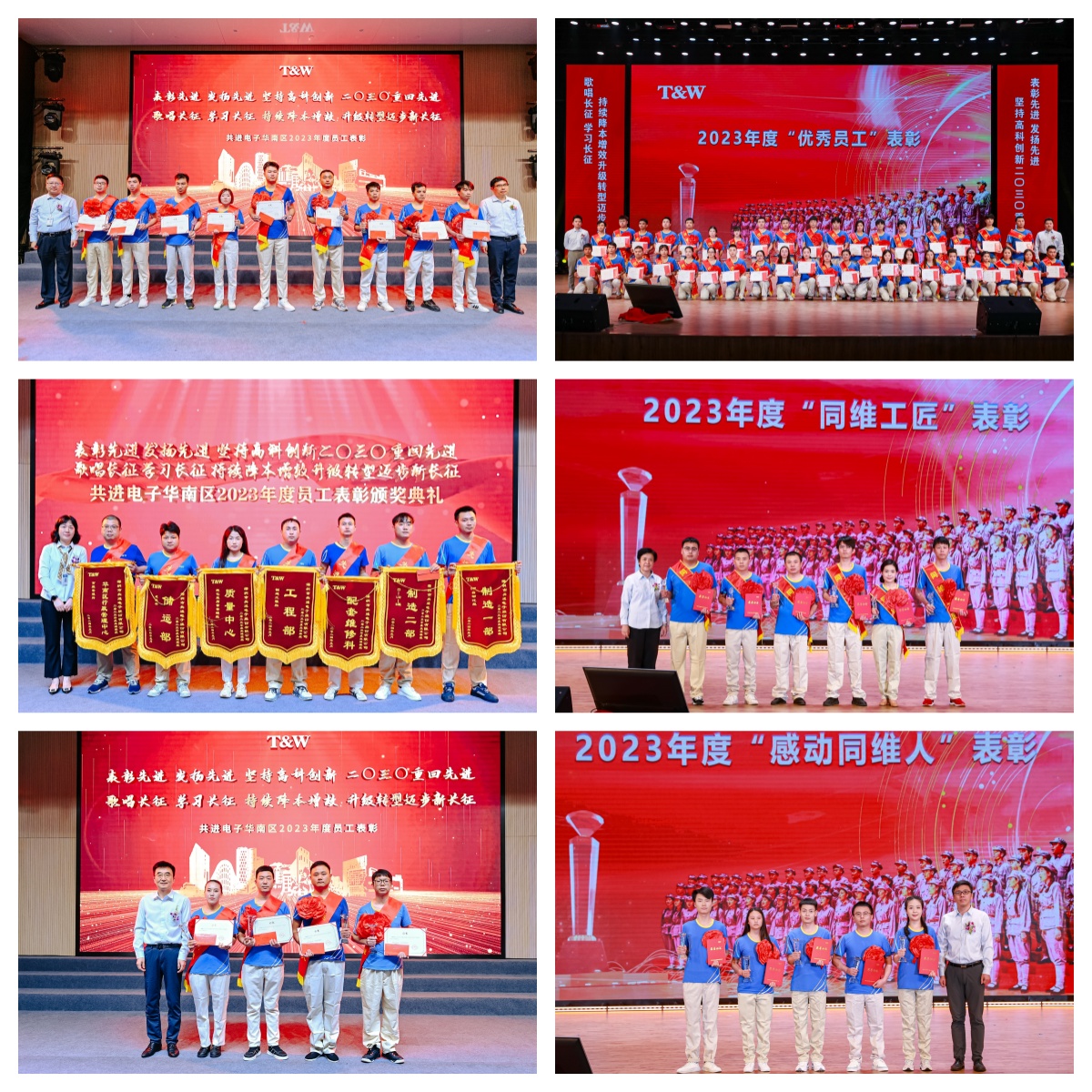 国内工厂厂长何亮对两地工厂2023年成绩做总结,汇报2024年发展规划。现场播放表彰视频,展现了优秀个人及团队的风采。公司领导共为103名优秀员工、15名工匠、9名感动同维人以及14个先进班组颁奖。