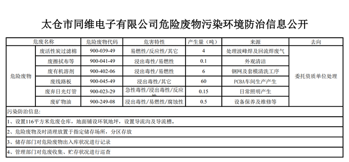 太仓市同维电子有限公司危险废物污染环境防治信息公开